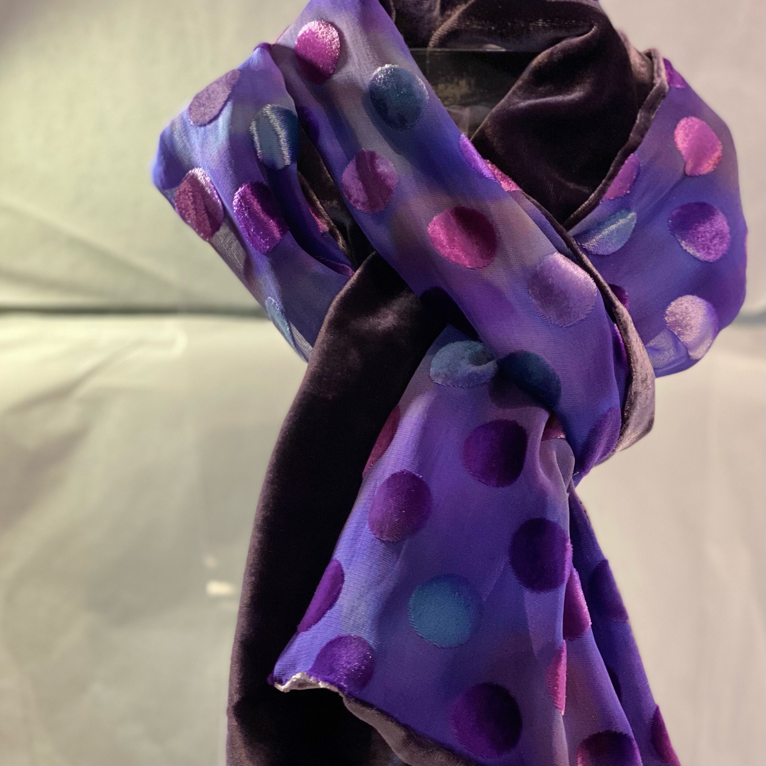 Silk velvet spot scarf with plain velvet lining. Beautiful quality and hand made by Diane Jones. 7 inches x 55 inches 17.5cm x 140cm.